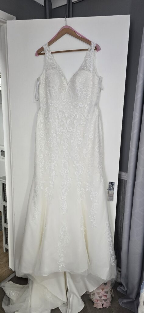 A traditional mermaid dress with dellicate button back. The ornate lace appliques flow effortlessly across the bodice and into the illusion straps.