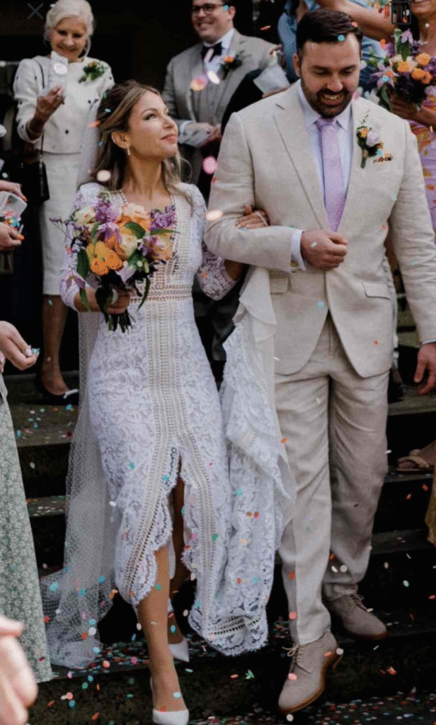 Panels of lace lined with silk crepe de chine alternate with sheer lace to create a summery feel. A deep V neckline and split in the skirt reveal glimpses of skin, while the waistline is accentuated by a sheer panel of embroidery.