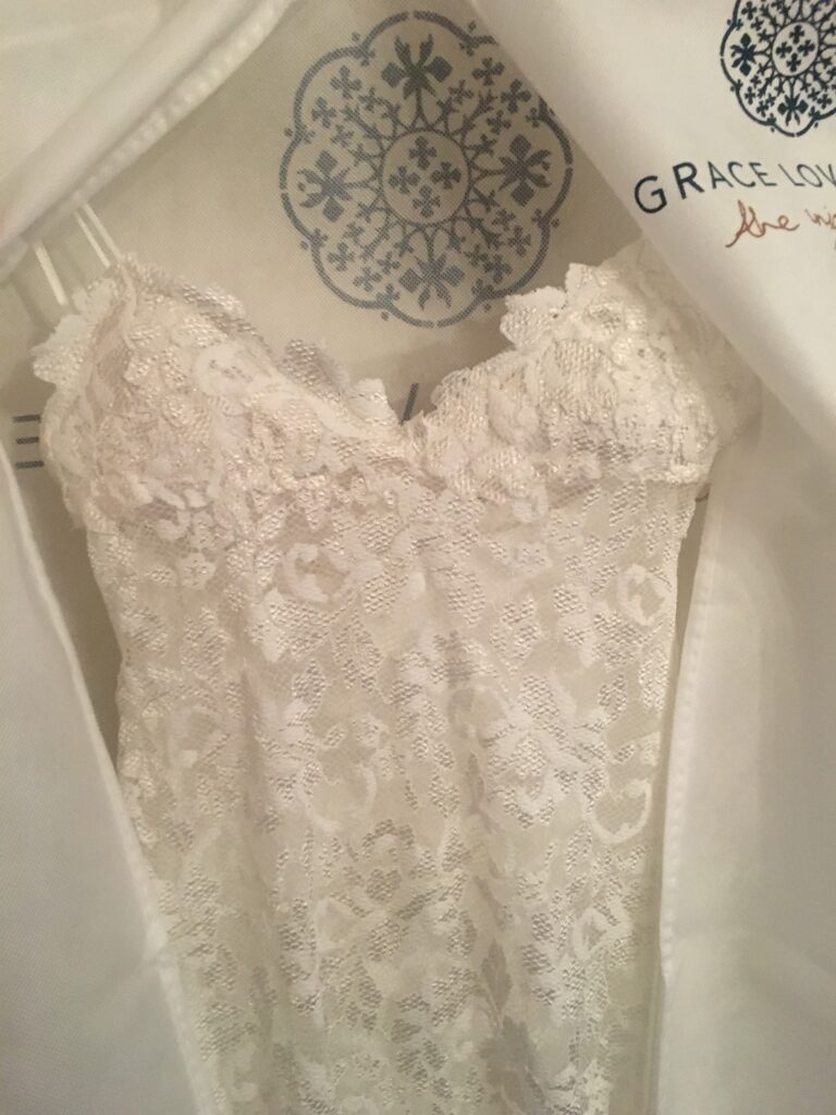 Dry cleaned and stored in wedding gown bag to prevent yellowing.