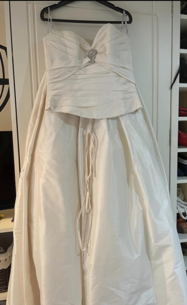 Dress was never worn as the couple split before the wedding. I have been asked to sell the dress. It’s a Maggie Sottero 2 piece with a veil