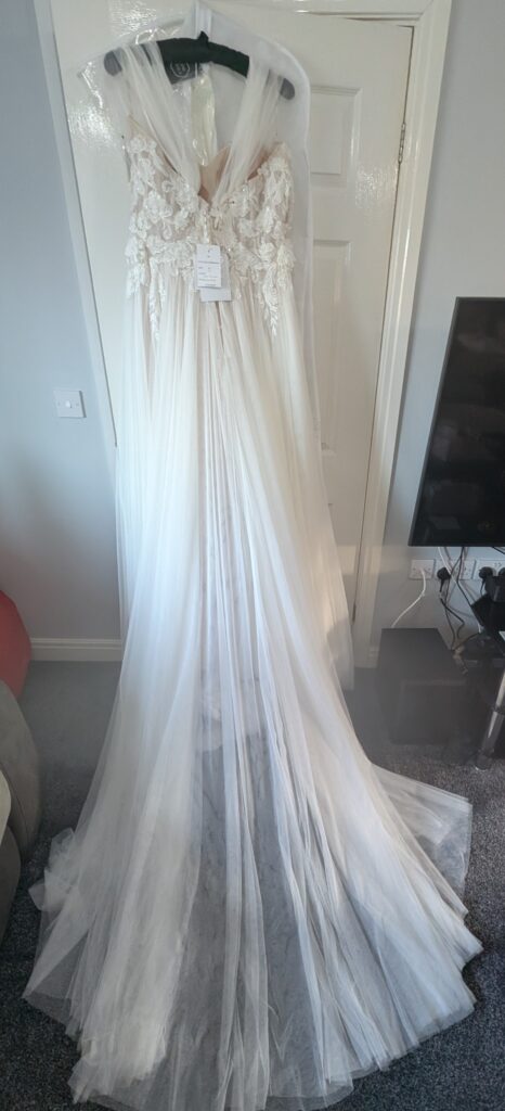 Only worn once when trying on and finding a dress. Pins have been left in where the straps were going to be sewn on.