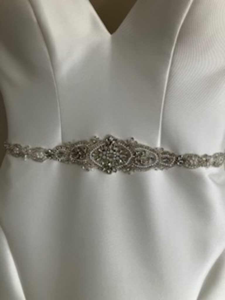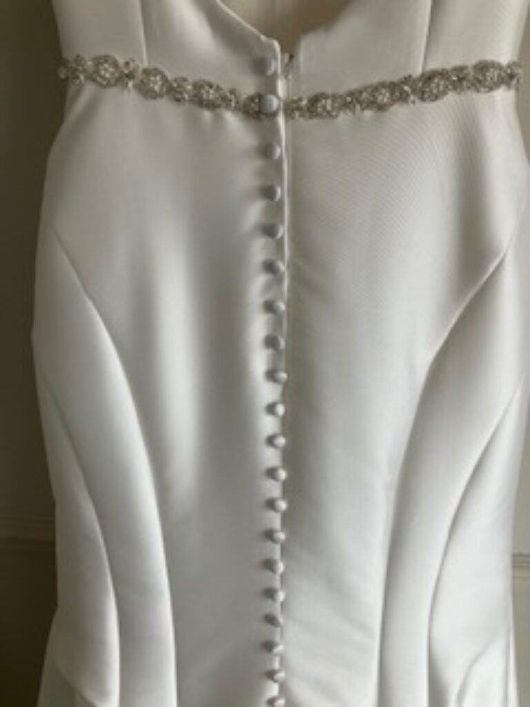 Martina Liana ivory fish tail dress with train. Spaghetti straps and a sparkly belt attached. Button down detail down the back. Also have a net over skirt to sell with it that can be removed.