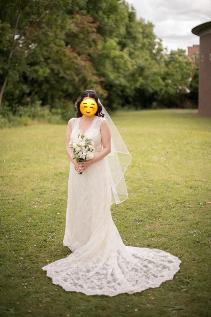 Pronovias Ederne Boho UK size 10 off white lace A-Line, backless. Tailored for petite 5ft 1, large cups inserted with boning and bustle. Good condition.