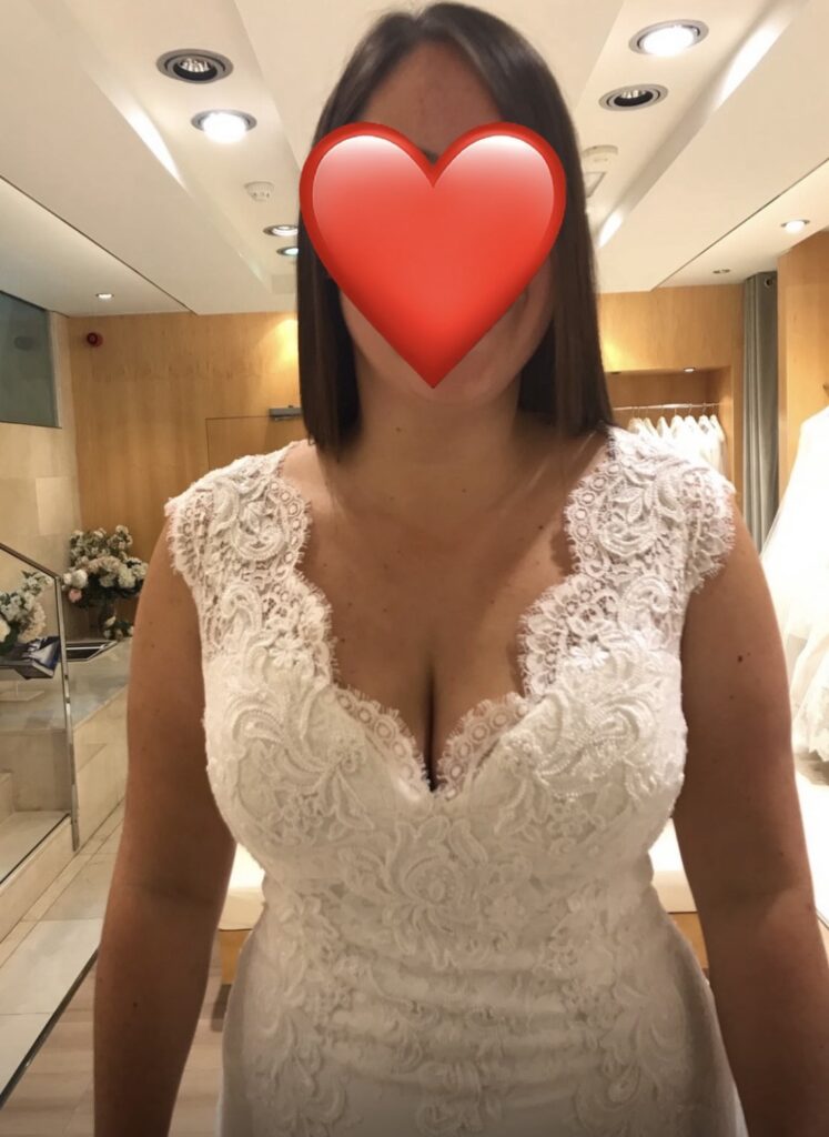 Pronovias DRUSILA V-Neck Crepe and Lace Wedding Dress, off white.