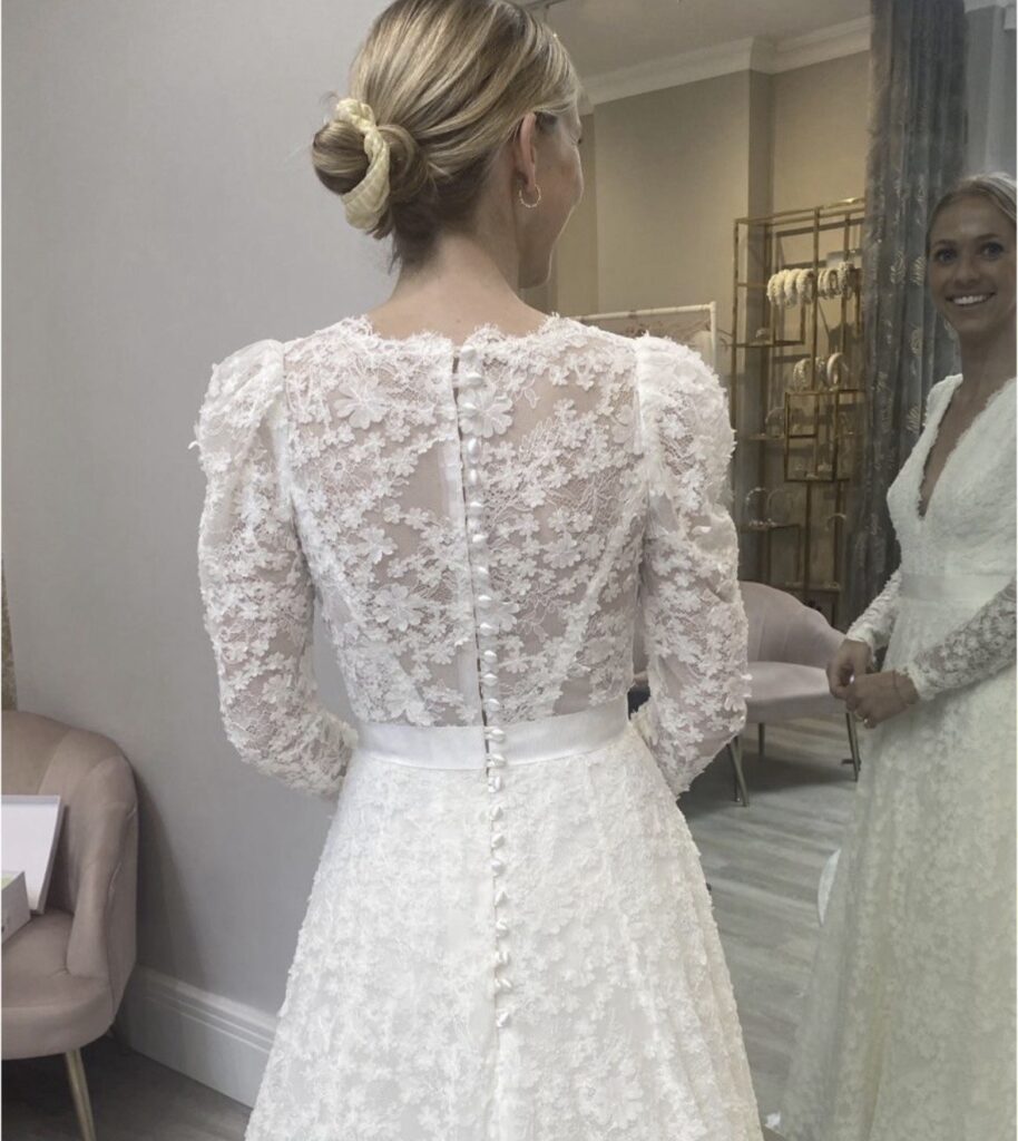 Sassi Holford Tatiana dress. Long sleeves with puff shoulders. Buttons down the back.