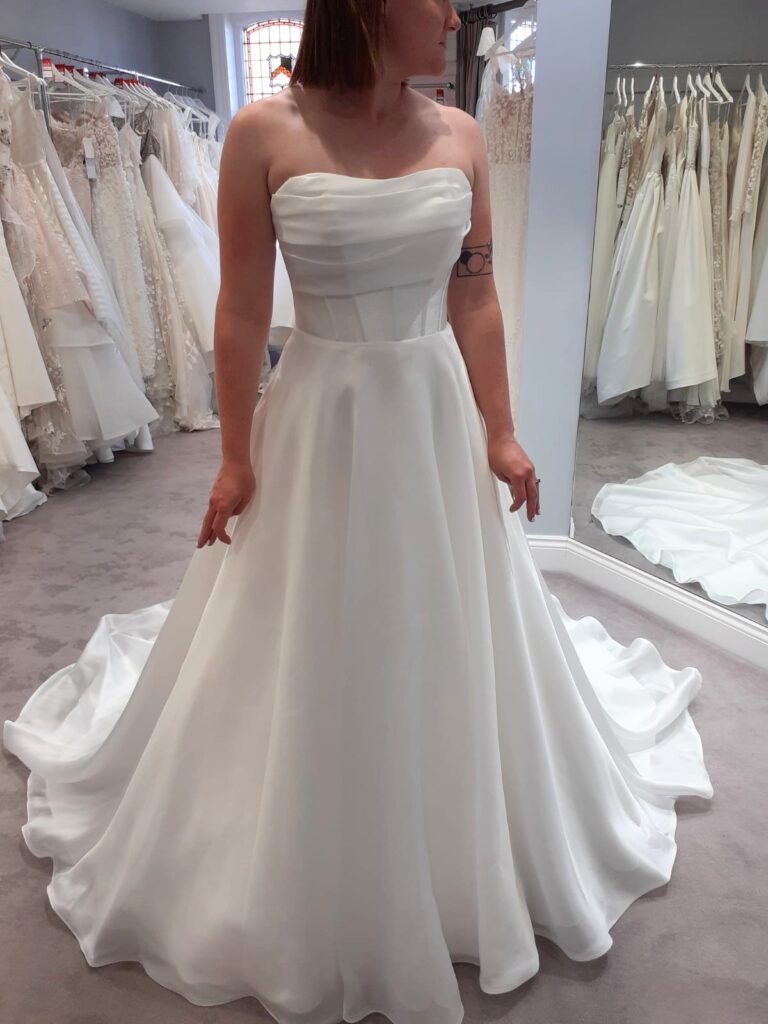 Stella York 7940 dress – pearl organza ballgown wedding dress. Draped strapless bodice, a straight across neckline with structured corset, ballgown skirt, discreet side pockets and fabric-covered buttons down the back. The dress is incredibly lightweight. It has been professionally dry cleaned and in good condition. Minimal alterations made, mainly to the length (to fit 5’7″ wearing flats) and the bodice brought in slightly. Made to fit a UK size 10 (dress is bridal size 14)