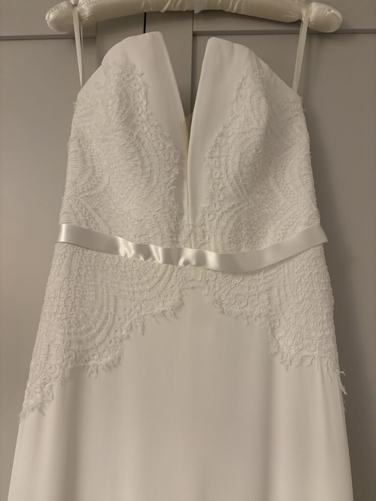 Has a gorgeous strapless, plunge neckline with lace detail, a ribbon waist band and a soft fitted crepe skirt.