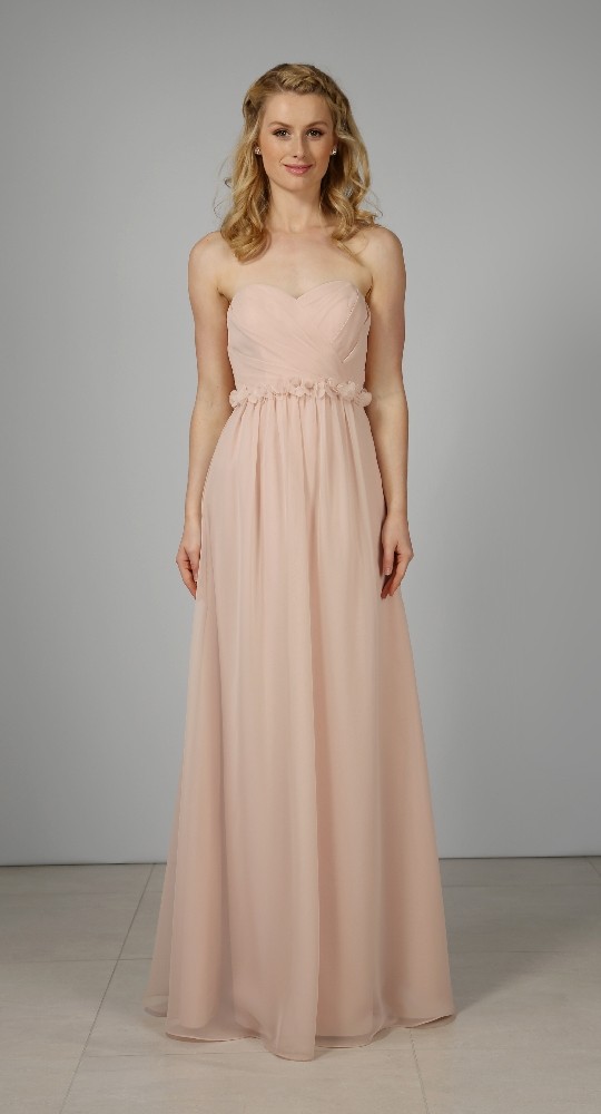 This pretty chiffon gown has an asymmetrical pleated bodice with a sweetheart neckline and a floor length chiffon double layer skirt. The pretty waistband is adorned with chiffon petals and sparkling sequins. Available in any chiffon colour. Shown in Rose.