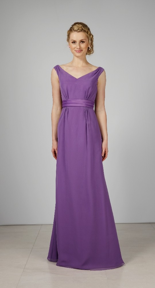 A simply elegant chiffon and satin bridesmaid gown with a v-neckline. The bodice has a lightly boned structure with side pinched pleating at the waist. The unlined pleated straps create an illusion v-backline with buttons at the neck and slit to the waist. The full length skirt is lightly gathered to provide an A-line silhouette. The gown is finished with a matching pleated satin waistband. Available in any chiffon colour. Shown in Purple Rain.