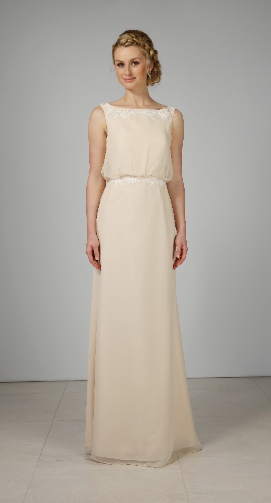 An elegant full length chiffon bridesmaid gown with a bateau neckline to the front and back with narrow straps. The bodice has a blouson effect overlay gently gathered at the waist with delicate ivory lace at the waist and neckline. Available in any chiffon colour. Shown in Champagne.