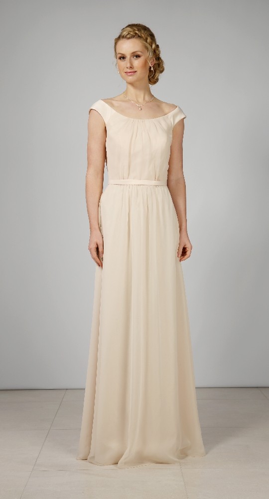 A simply elegant chiffon bridesmaid gown. The full length gown has soft gathering at the centre waistline of the bodice and skirt with a narrow satin waistband. The scooped neckline has soft gathering with satin slighly off the shoulder straps. Available in any chiffon colour. Shown in Champagne.