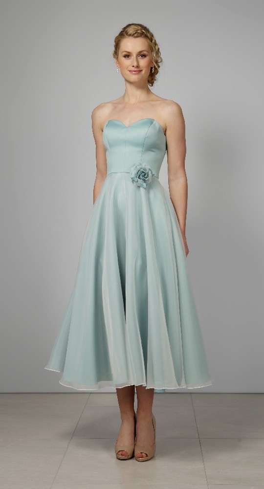 This elegant tea-length bridesmaid gown has a fitted satin sweetheart bodice which flows into a graceful A-line tea-length skirt with organza overlay. A single floral corsage adds an extra touch of glamour at the waistline. Available in any satin colour, with Ivory organza. Shown in Mint.