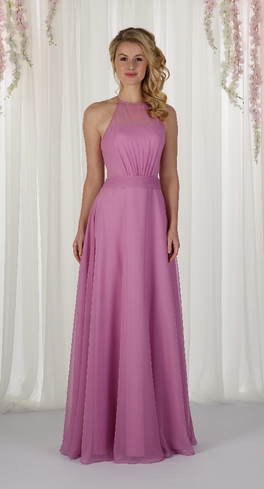 This elegant full length chiffon gown has a fitted bodice with sheer halter neckline with self-tie bow. The bodice has gathering to the centre front with a wide pleated waistband graduating at the centre back. The gown is complete with a full A-line skirt. Secured with an invisible zip and covered buttons. Available in all chiffon colours. Shown in Candy and Granite.