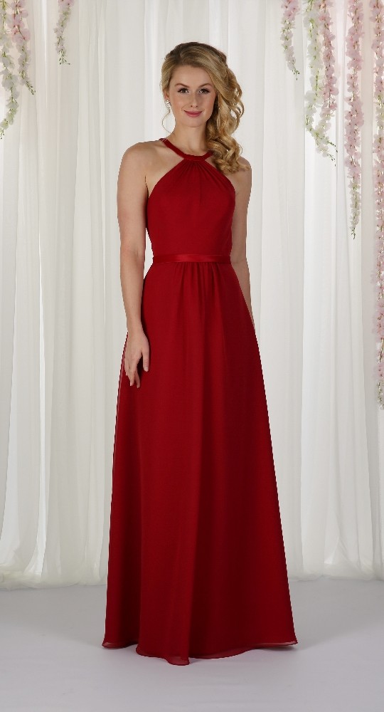 A feminine chiffon gown with gathered high neckline, satin neckband and racer style back. The fitted bodice flows gracefully into the full length A-line skirt with centre gathering and satin waistband. Secured with an invisible zip and satin covered buttons.