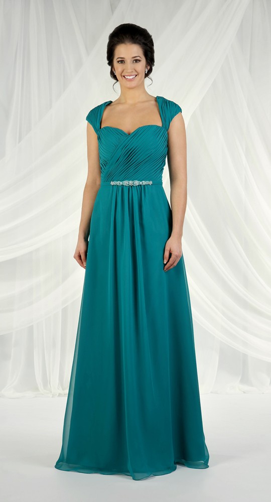 A flattering chiffon gown with a pleated bodice, sweetheart neckline and keyhole back. Complete with a lightly gathered chiffon skirt and intricate beading at the waistline. Available in all chiffon colours. Shown in Oasis.