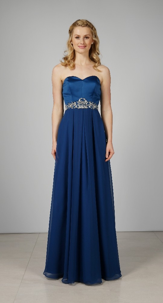 This strapless bridesmaid gown has a satin bodice with a sweetheart neckline and silver beaded waistband. The inverted pleats within the chiffon full length skirt create an A-line silhouette. Available in any chiffon colour. Shown in Midnight.